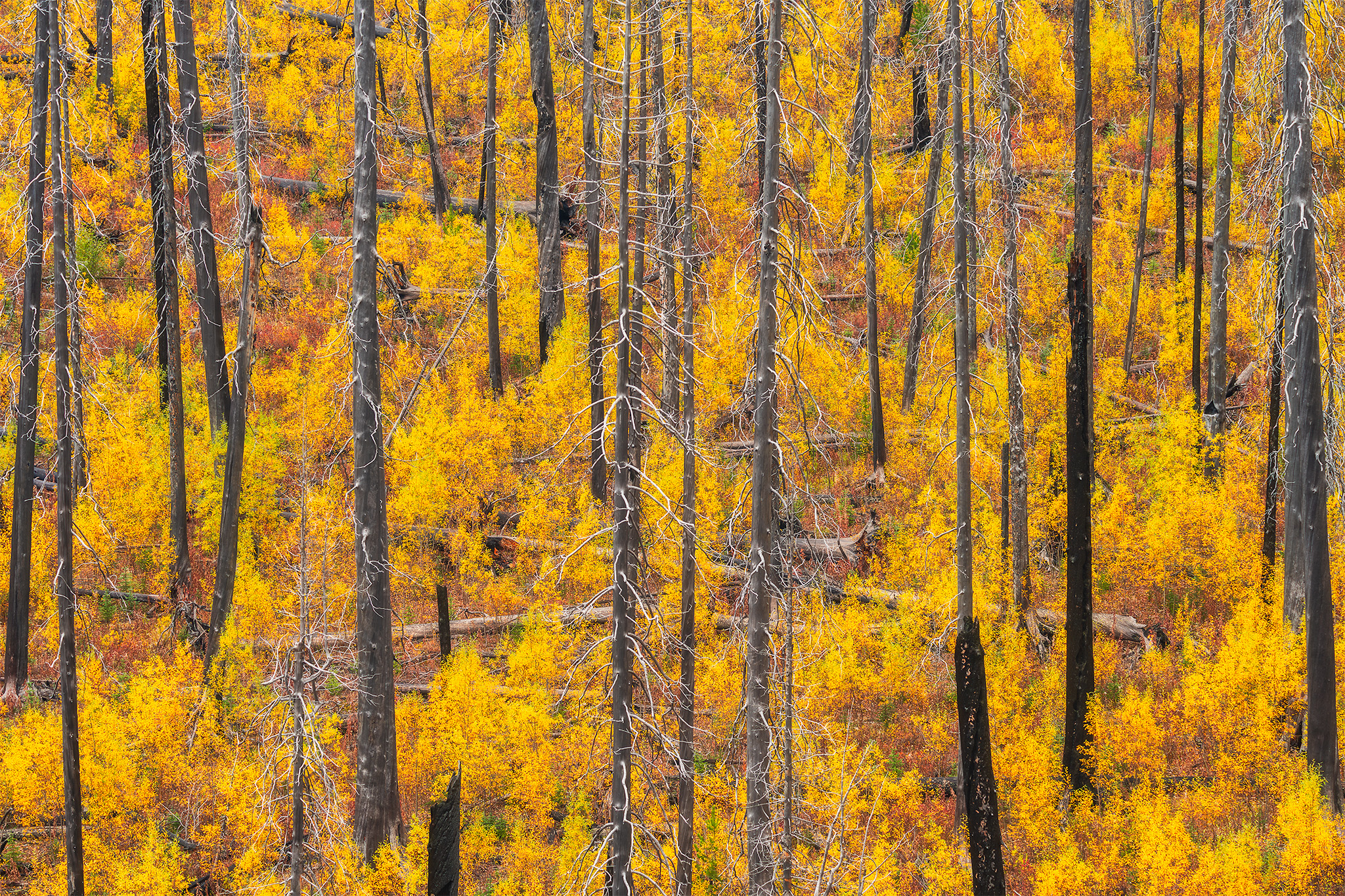 A couple of days later, on the hike back, the rain was gone. The weather was turning and soft, diffused light settled over the Canadian Rockies, exactly the kind that lets scenes like this come to life. When we reached that same patch of burnt forest, it was as if the place had been waiting. The underbrush lit up against the black trunks like flames.